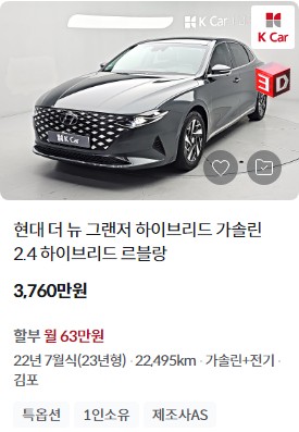 2022년식 더 뉴 그랜저 하이브리드는 K Car 특가매물로 3,220만원에서 3,990만원에 판매되고 있습니다. 이 모델은 신형에 가까운 성능과 디자인을 유지하고 있어, 높은 성능과 품질을 원하는 소비자들에게 적합합니다.