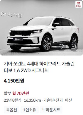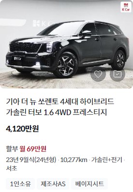 2023년식 쏘렌토 4세대는 K Car 실매물에서 4,030만원에서 4,120만원 사이에 거래되고 있으며, 최신형 차량과 비슷한 성능을 제공하면서도 가격이 조금 더 저렴해 많은 소비자들이 선호합니다.