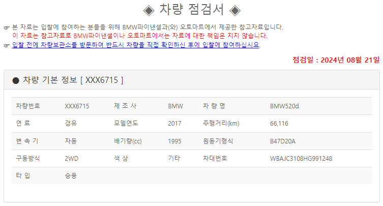 공매는 중고차 매매처럼 수리가 이루어지지 않기 때문에, 가능하다면 입찰 전에 직접 보관소에 들러 차량 상태를 확인해보는 것이 좋습니다. 차량 점검서는 참고 자료일 뿐이므로, 실제 상태를 100% 신뢰하기는 어렵습니다.