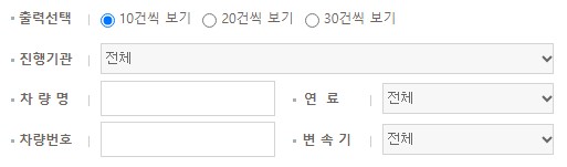 모든 차량을 살펴보는 대신, 검색 조건을 설정해 필요에 맞는 차량을 검색할 수 있습니다. 검색 조건은 진행 기관, 보관소, 연료, 예정가, 모델 연도 등으로 조정할 수 있습니다.