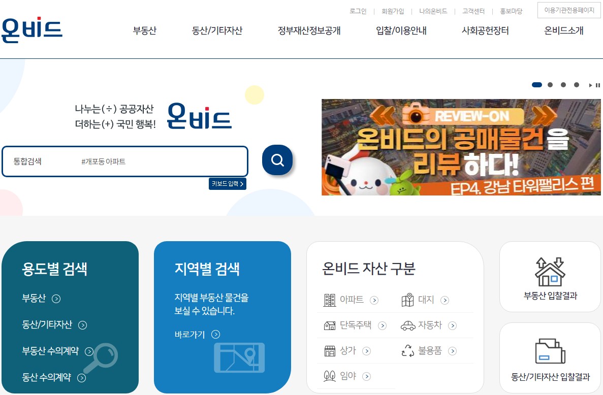 온비드는 국가에서 운영하는 자동차 공매 사이트로, 오래된 차량이 많지만 그만큼 저렴한 가격에 차량을 구입할 수 있습니다. 특히 경제적인 차량을 찾는 사람들에게는 좋은 선택지입니다. 사이트 상단의 동산/기타자산 탭에서 다양한 공매 차량을 확인할 수 있습니다.