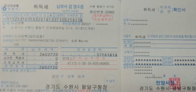 취등록세 영수증은 차량 구매 시 납부해야 하는 취등록세를 입증하는 서류입니다.
