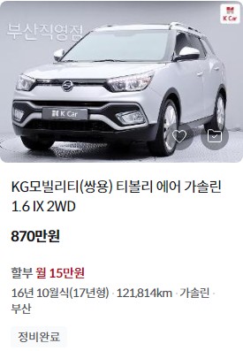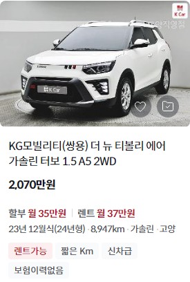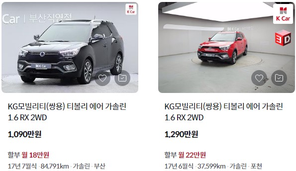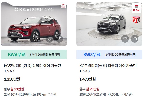 2023년식 티볼리 에어는 1,930만 원에서 2,210만 원 사이로, 연식에 비해 매우 우수한 상태를 유지하고 있으며, 신차에 비해 다소 저렴한 가격대가 형성되어 있습니다. K Car 실매물로도 다수 등록되어 있어 다양한 선택지를 제공합니다. 최신형에 가까운 성능과 디자인을 원하지만, 신차 구매가 부담스러운 소비자들에게 좋은 선택이 될 수 있습니다.