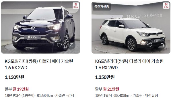 2023년식 티볼리 에어는 1,970만 원에서 2,040만 원 사이로 K Car 특가 매물로도 종종 나타납니다. 연식이 매우 짧기 때문에 신차에 가까운 상태를 유지하고 있으며, 성능과 디자인이 최신 모델에 준합니다. 신차급 차량을 좀 더 경제적인 가격으로 구입하고자 하는 소비자에게 적합합니다.