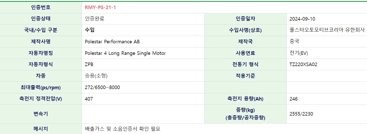 2023년 10월, 환경부는 폴스타 4의 인증 내용을 공식적으로 발표했습니다. 폴스타 4는 스웨덴의 전기차 브랜드 폴스타가 독립적으로 제작한 세 번째 차량이며, 두 번째 전기차 모델입니다. 쿠페형 SUV 스타일로 디자인된 이 차량은 싱글 모터를 탑재한 후륜구동 모델로, 최고출력 272마력을 발휘합니다. 가속 성능 역시 우수해 정지 상태에서 시속 100km까지 7.1초만에 도달합니다.